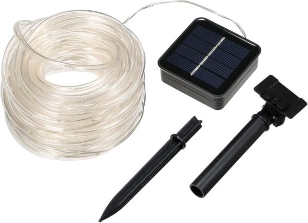 Güneş enerjisi ile çalışan 10 metre uzunluğundaki bu solar şerit LED, sıcak beyaz ışık verir ve dekoratif aydınlatma için idealdir. Elektrik bağlantısına gerek olmadan dış mekanlarda kolayca kullanılabilir.